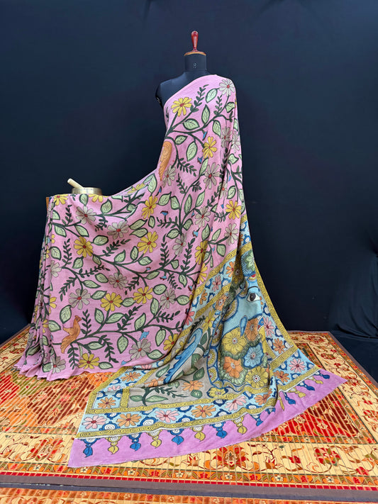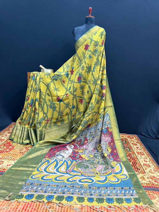 Our most loved pen Kalamkari saree collection on pure silk cottonsMaterial: SilkcottonBlouse : YESAs these are hand painted any variations in the design is considered as the uniqueness of the...