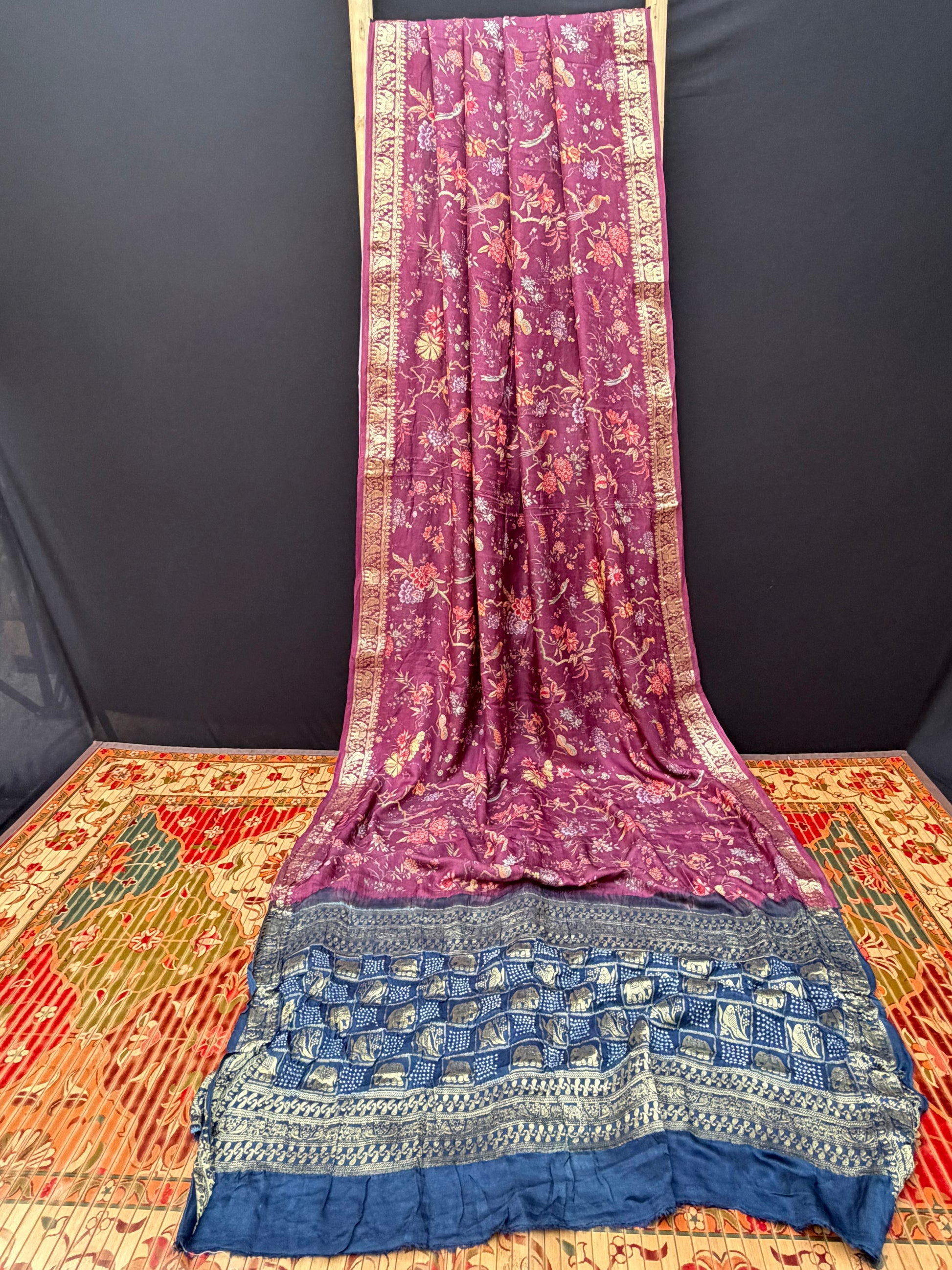 A gorgeous digital printed gajjisilk saree with garchola and raibandej pallu.This saree also comes with a handknotted bandini blouse.