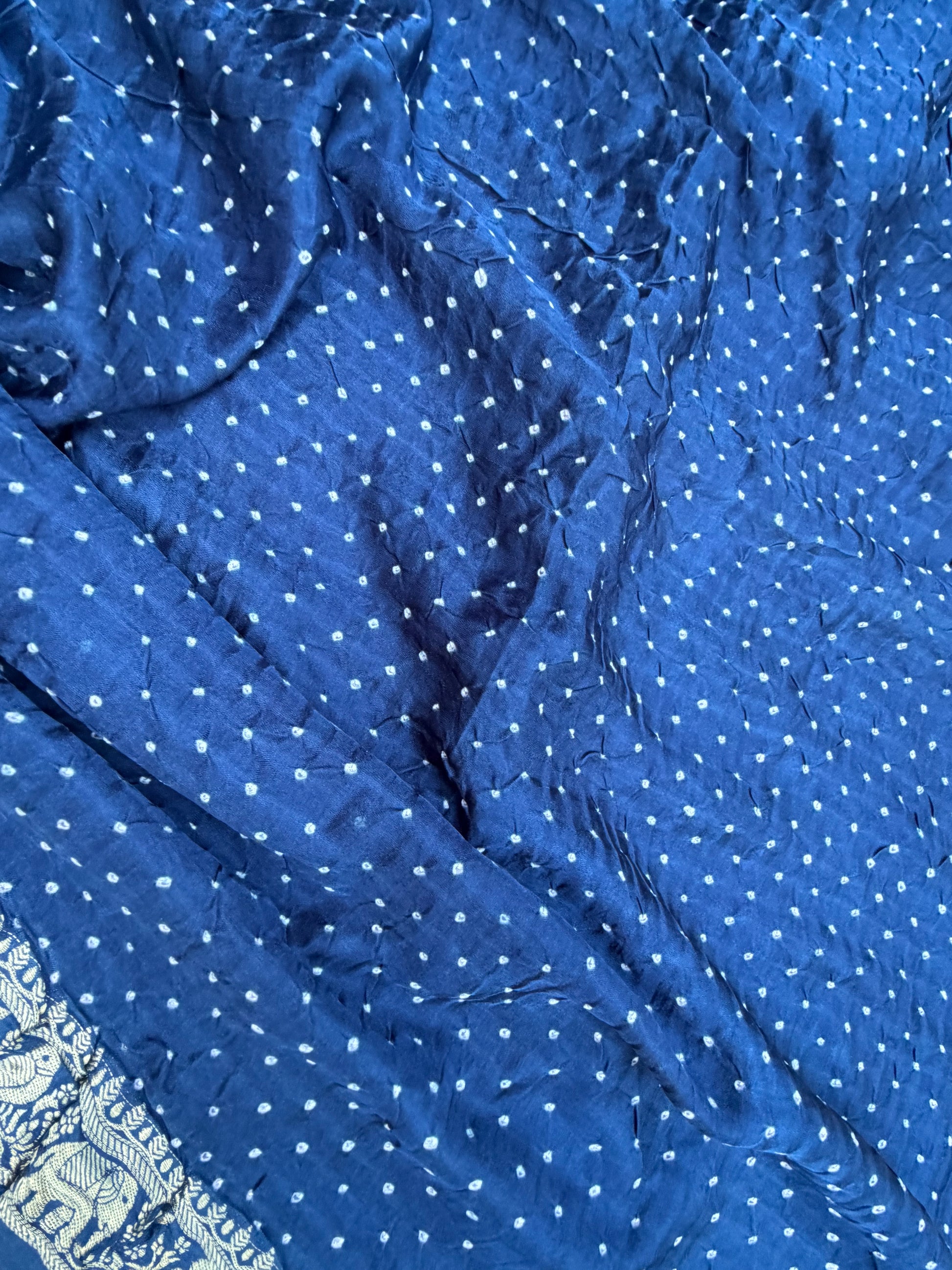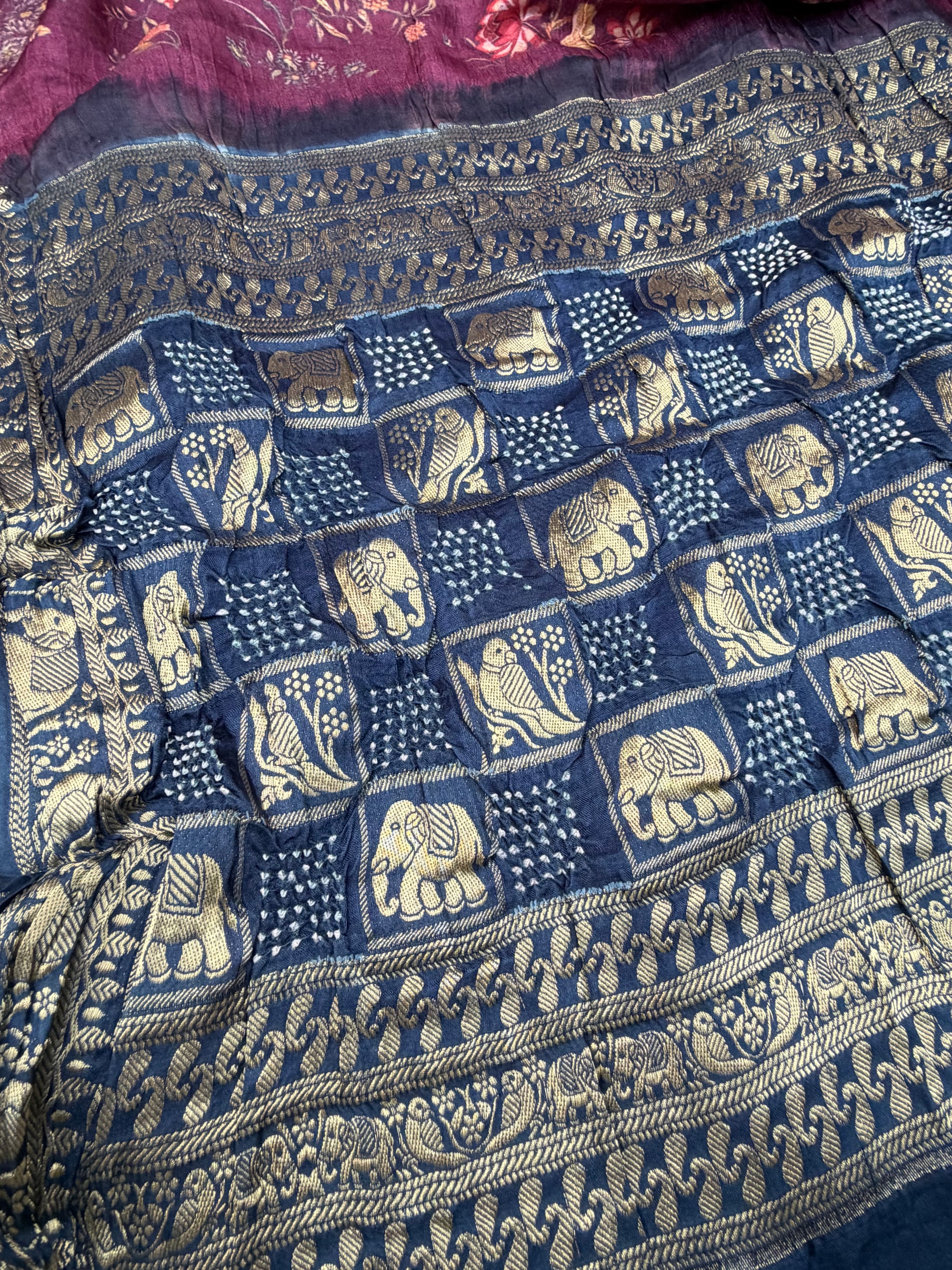 A gorgeous digital printed gajjisilk saree with garchola and raibandej pallu.This saree also comes with a handknotted bandini blouse.  One more of our collection that represents the fusion of two...