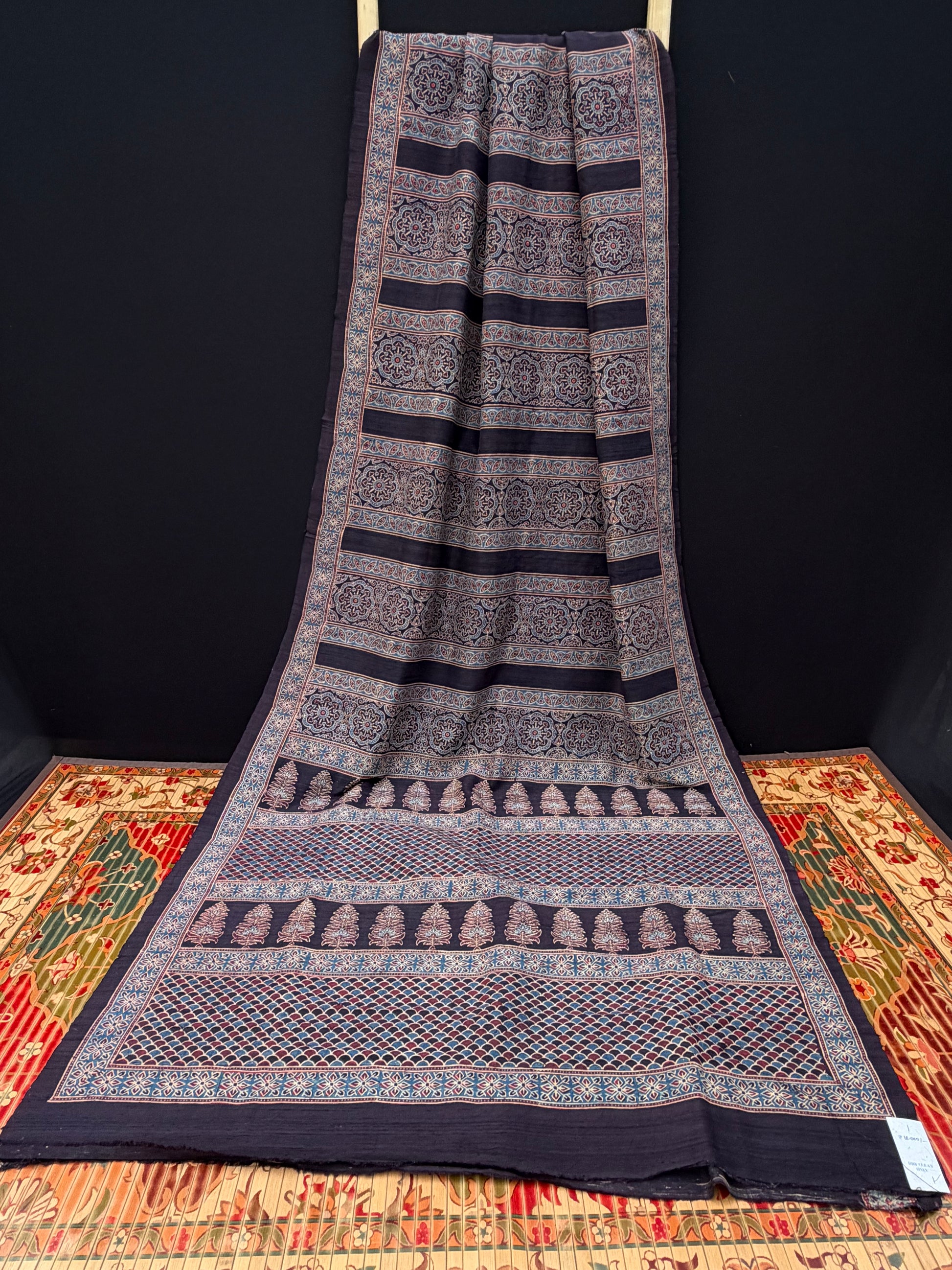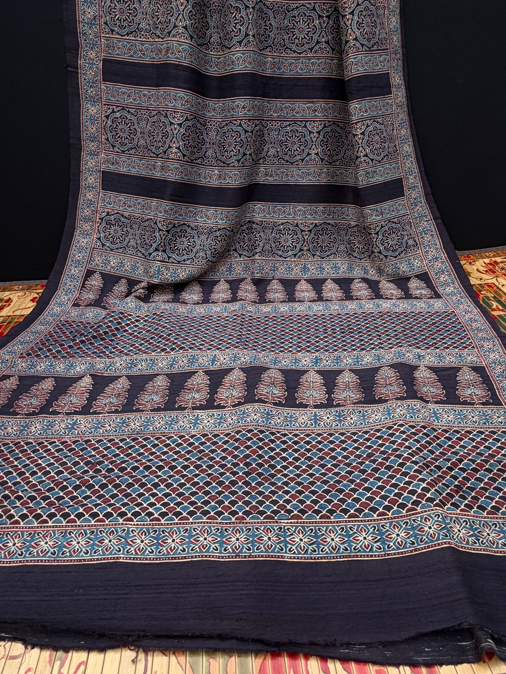 These are pure 100gm raw silk sarees with some unique handblocks of Ajrakh craft. A perfect saree material for the winters. These rawsilks flow beautifully as they are softened in the process of Ajrakh dyeing.