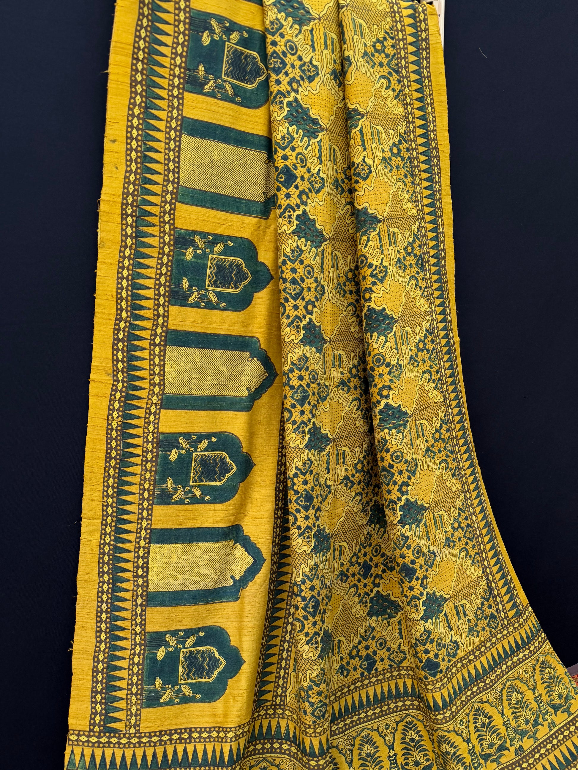 These are pure 100gm raw silk sarees with some unique handblocks of Ajrakh craft. A perfect saree material for the winters. These rawsilks flow beautifully as they are softened in the process of Ajrakh dyeing.
