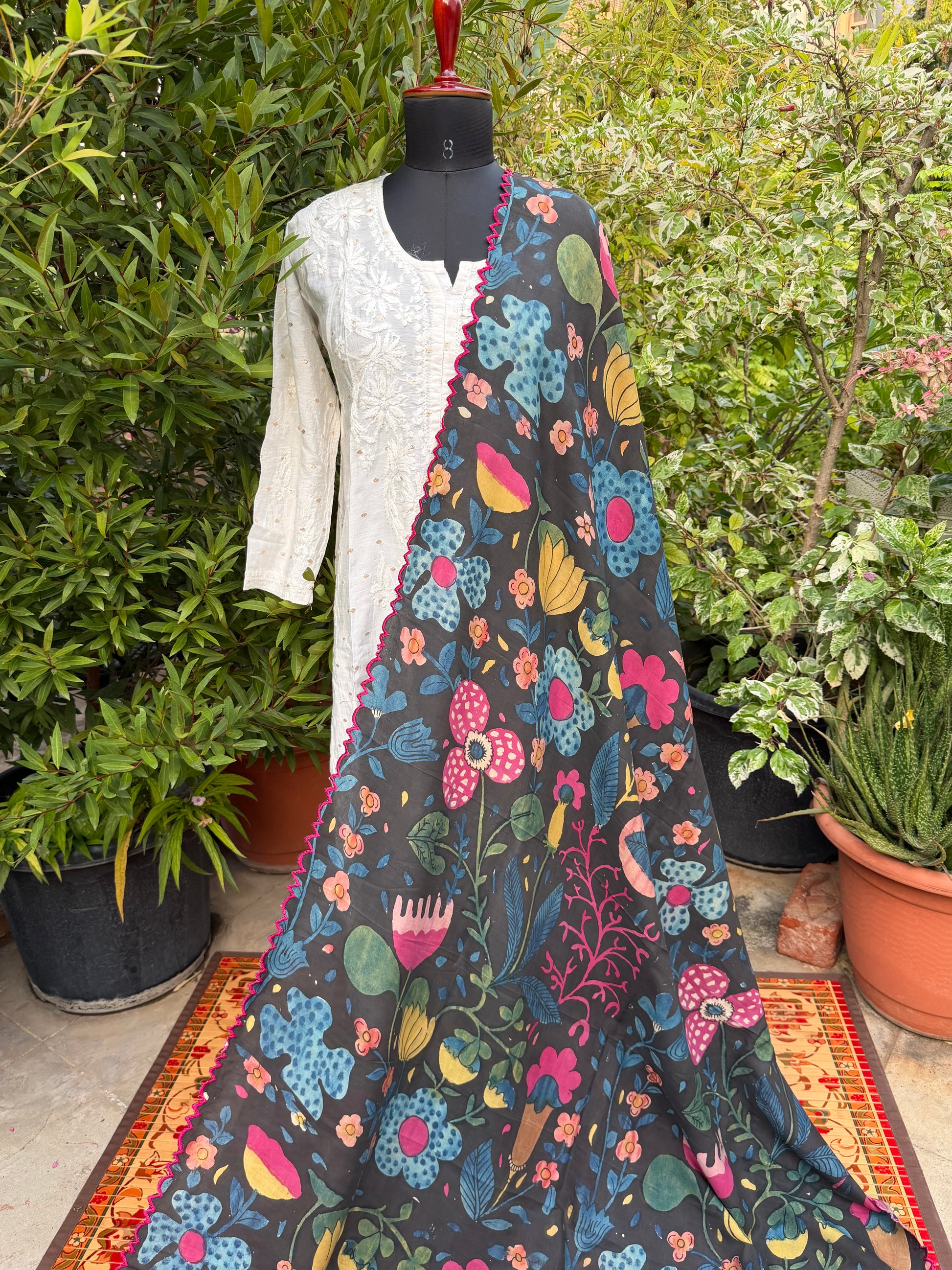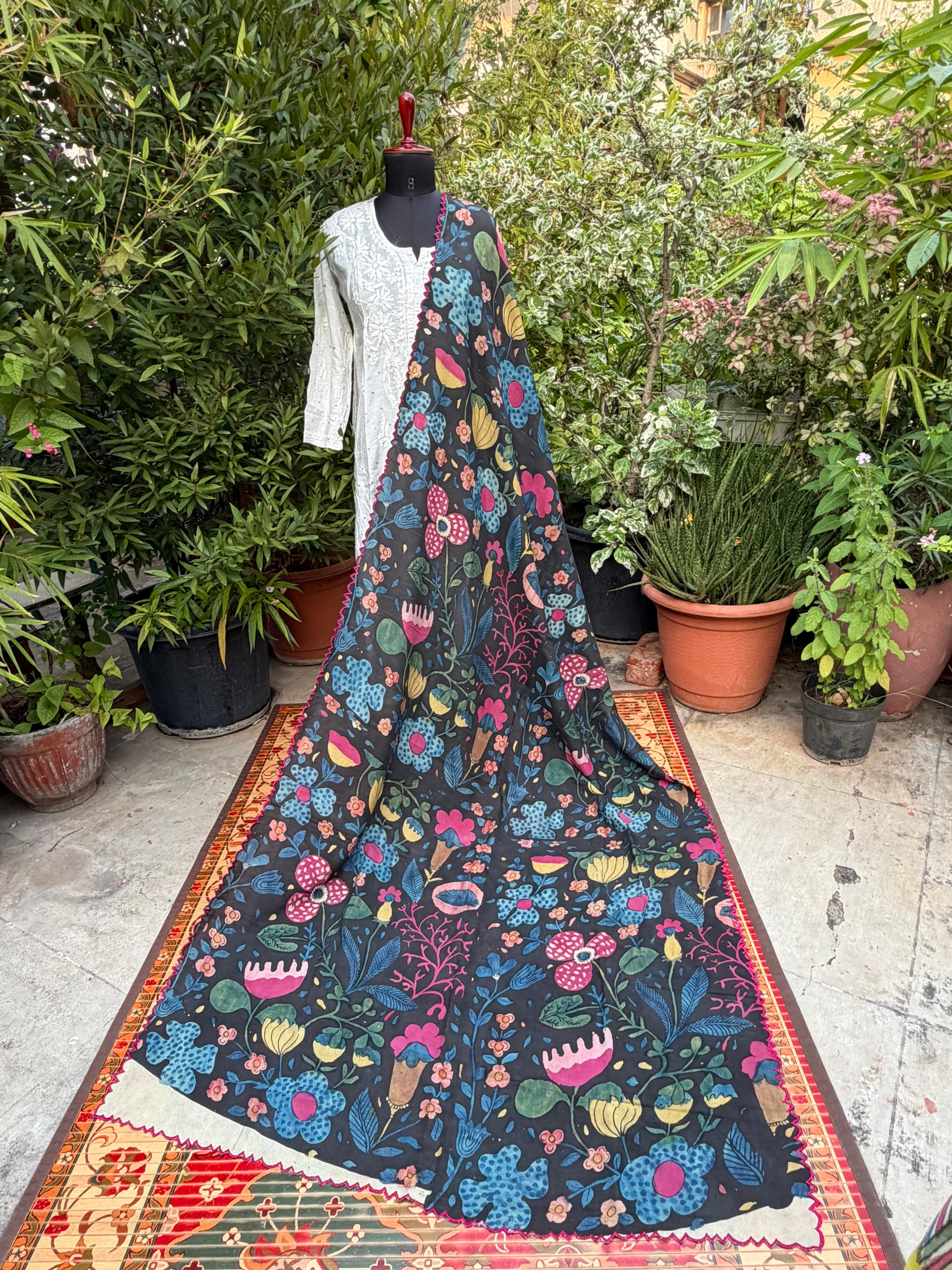 Gorgeous collection of pen kalamkari dupattas. The material is pure silkcotton which gives you a crepe kind of a flow for the dupatta.  Length 2.4 mtr approx with tasselsWidth 45...