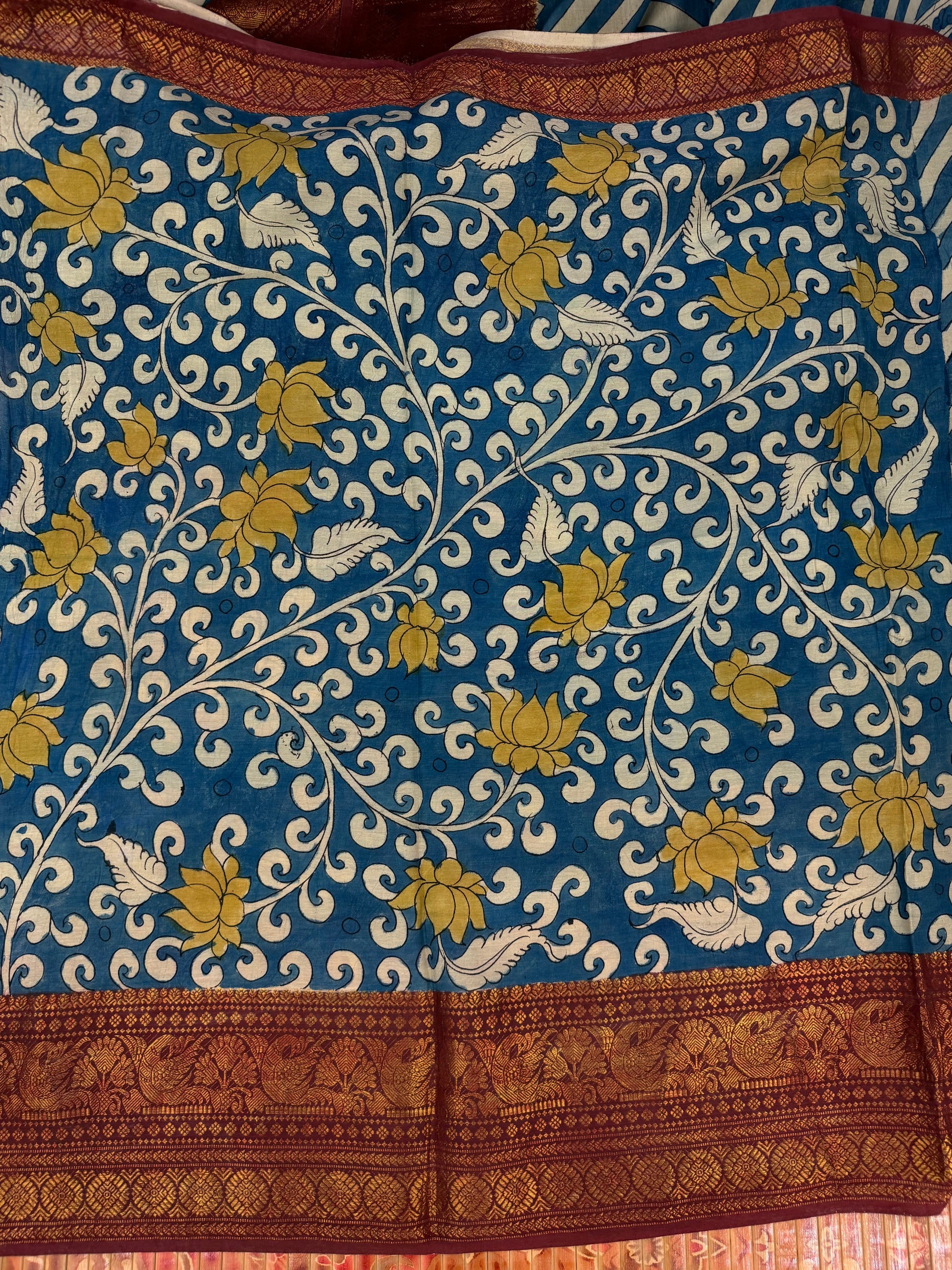 Our most loved pen Kalamkari saree collection on pure silk cottonsMaterial: SilkcottonBlouse : YESAs these are hand painted any variations in the design is considered as the uniqueness of the...